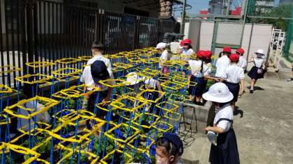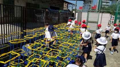 支柱を立てた「アサガオ」に、たっぷりの水をあげています。