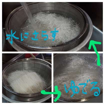 はるさめは、さっとゆでてもどし水にさらして調理しています。