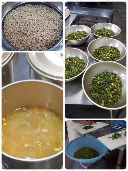 今日のスープに入っているてぼ豆は、日本で主に白あんの原料になってることを児童に伝えると興味をもって給食を食べていました。
