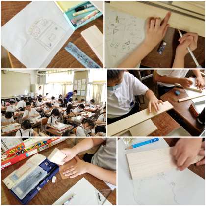 4年生が、図画工作科で「ギコギコ コロコロ たのしいなかま」の下絵をかいています。