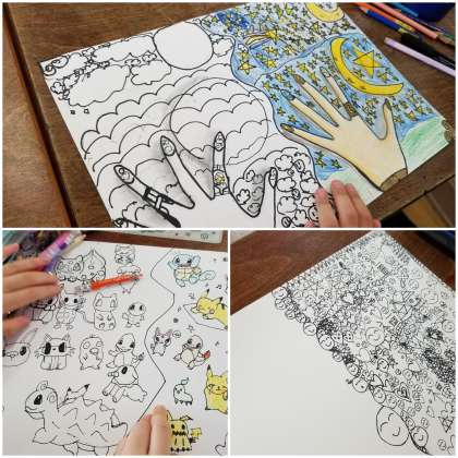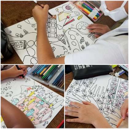 ネームペンと色鉛筆を使って、5年生がステキな絵を描いています。