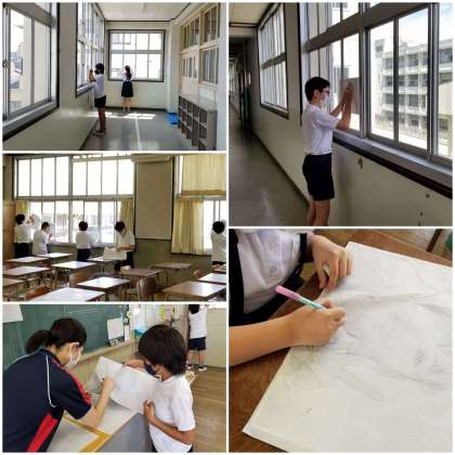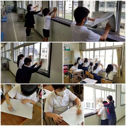 満面の笑顔の写真をトレーシングペーパーに写し取っています。