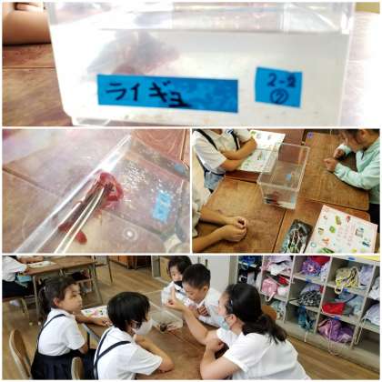 生活科で飼育する「ザリガニ」の名前をみんなで相談しています。