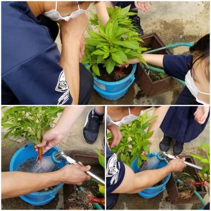 理科実験のために、学習園で育てた植物を抜き取り、根っこについた土を洗い流しています。