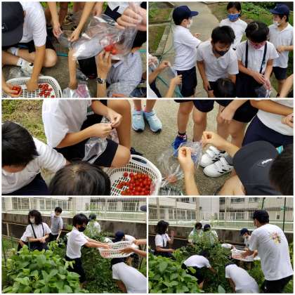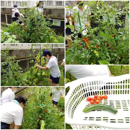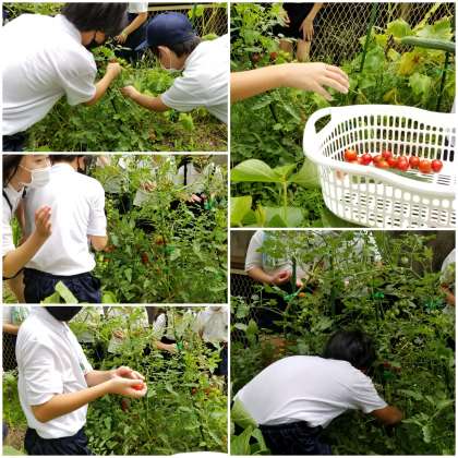 栽培委員会が、昼休みに集まって収穫作業をしています。