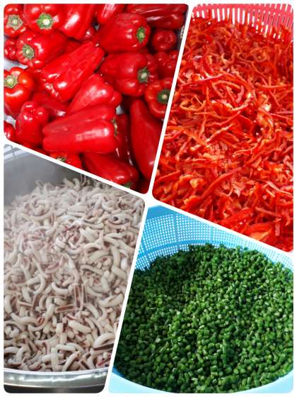 パエリアには、旬の赤ピーマンを使っています。赤ピーマンの赤、さんどまめの緑で彩りのよい仕上がりになっています。