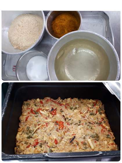 今日の献立は、パエリア・ウインナーとキャベツのスープ・みかん缶・コッペパン・ブルーベリージャム・牛乳でした。