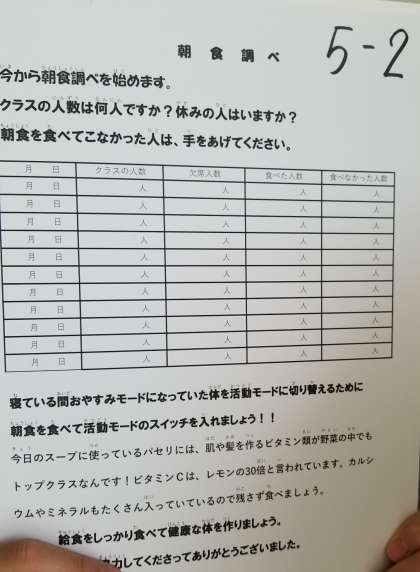 「毎月19日は食育の日」にちなんで、20日(月)に給食委員会が、朝食調べをします。