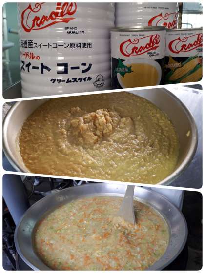 コーンスープは、クリーム状のスイートコーンのとろみとコクを生かしたスープで、どちらも児童に人気の献立でした。
