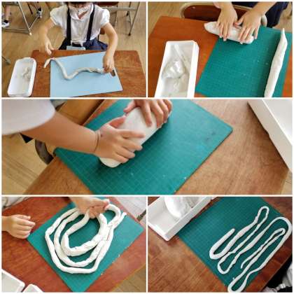 全身の力を使って、粘土をこねたり伸ばしたり・・・。