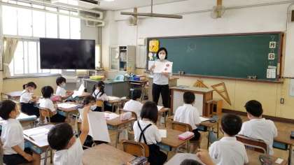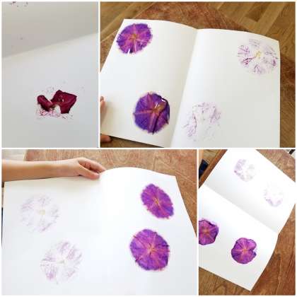 自分で育てた「アサガオ」を使って、たたき染をしています。