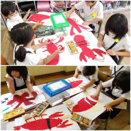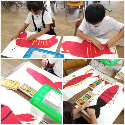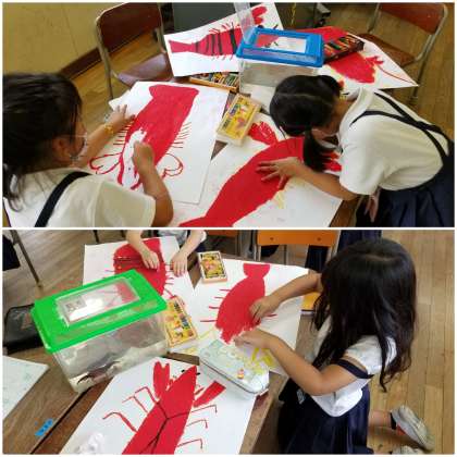 「先生!手が真っ赤」と言いながら、笑顔で描いています。