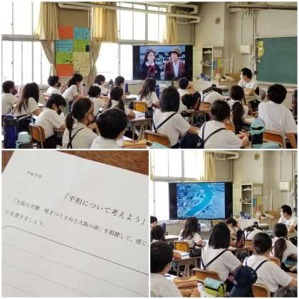 5年生が、「大阪大空襲」のDVDを資料に平和について考えています。