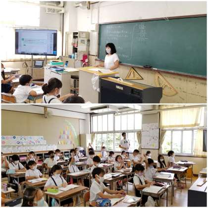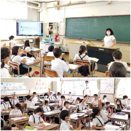 算数科の学習で、今日の問題を見て、昨日の問題との違いを考えています。