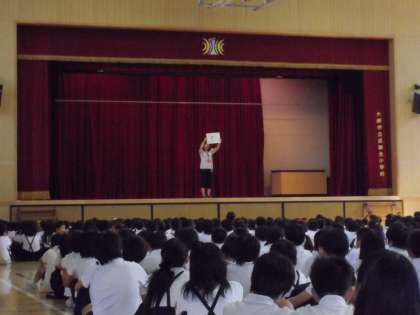 写真は、図書担当の先生が、終業式に本を紹介している様子です。