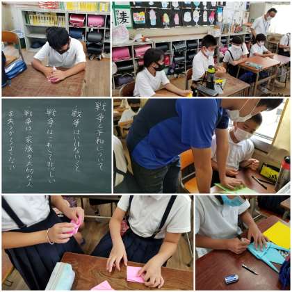 各学級で、平和について話し合ったり折り鶴に願い事を書いたりしました。