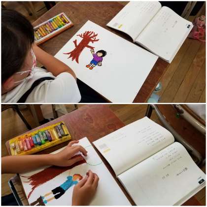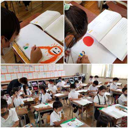 詩『紙ふうせん』『夕日がせなかをおしてくる』をよんで想像したことを絵に表しています。