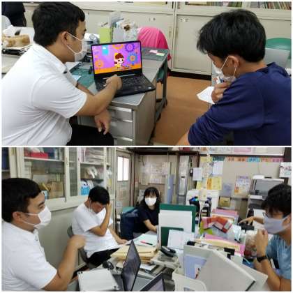 担任とC−NETが、外国語活動の時間の事前打ち合わせをしています。