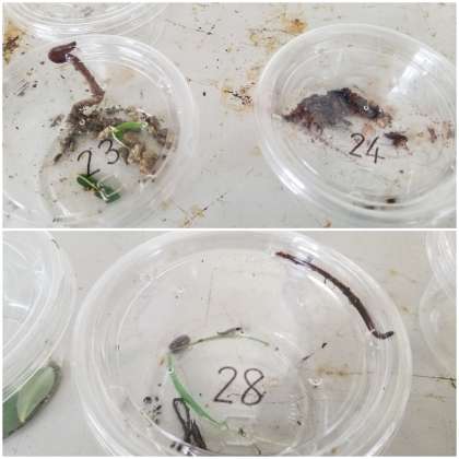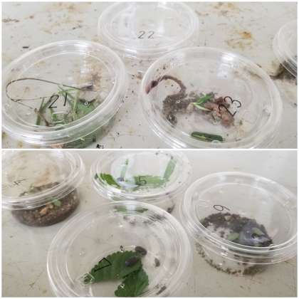1年生の教室前に、子ども一人一人が見つけた「生き物」がいます。