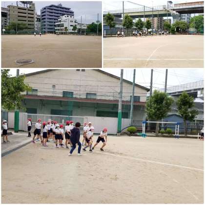 4年生が晴れ間を使って運動場で50m走のタイムをはかっています。