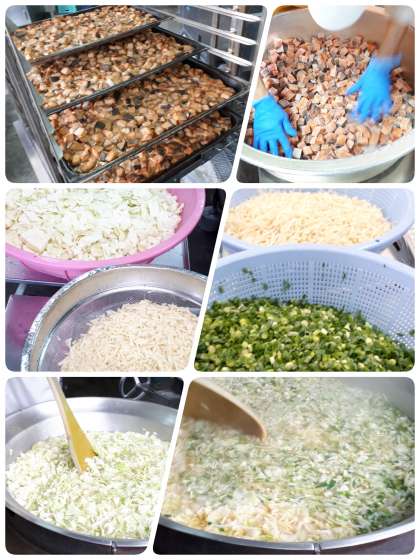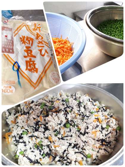 高野どうふのいり煮は、豚ひき肉とだしのうま味を高野どうふに含ませて仕上げています。今日の高野どうふは、粉末状のものを使っています。