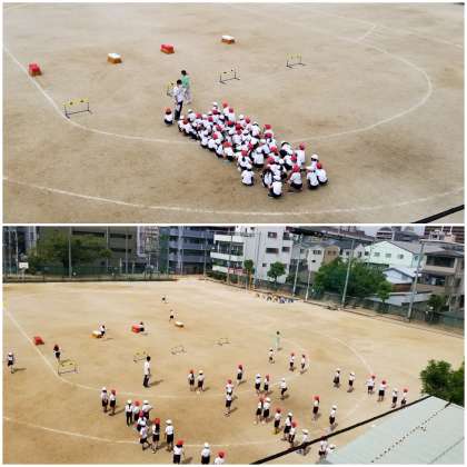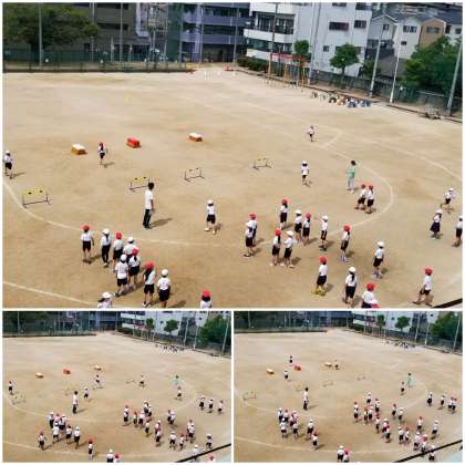 2年生が、ハードルを跳び越えたり、跳び箱に飛び乗ったりしながらゴールめざして走っています。