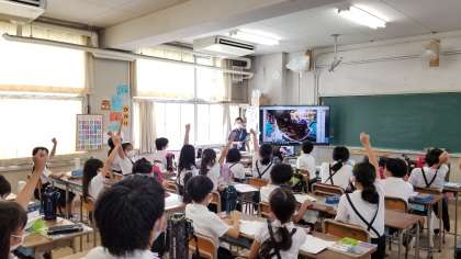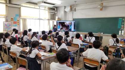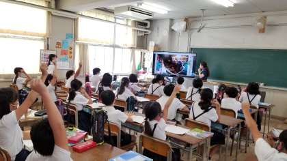 社会科の学習で、「まきあみ漁」の写真を見て気づいたことを発表しています。