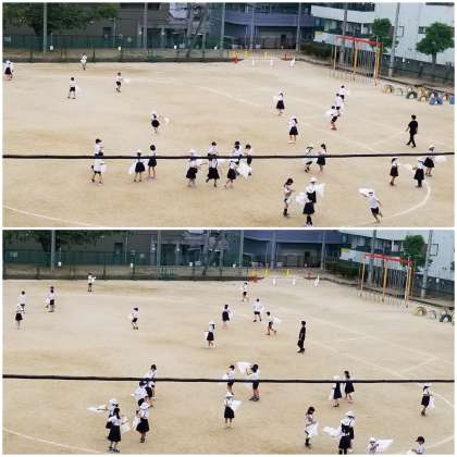 運動場を、ふくろをもって走る子ども達。