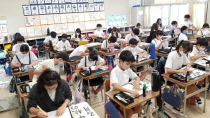 手本をじっくり見て、一文字ずつ丁寧に書いています。