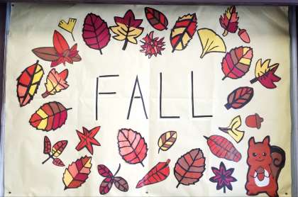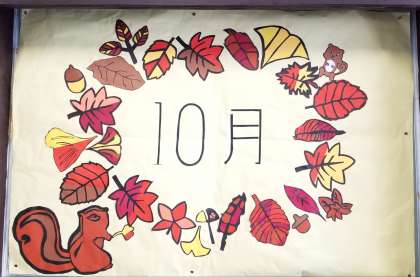 玄関には、4年生の子ども達が作った「秋」が掲示されています。