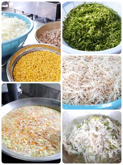 ウインナーと野菜のスープは、ウインナー・たまねぎ・キャベツ・にんじん・コーンと彩りのよいスープになっています。