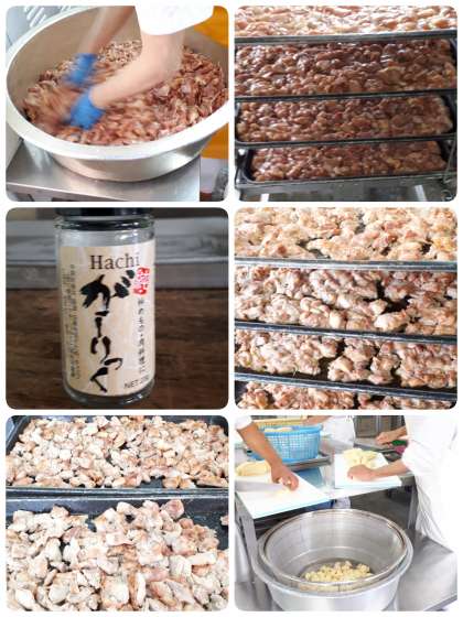 鶏肉のガーリック焼きは、料理用ワイン・塩・粗挽きこしょう・ガーリック・こいくちしょうゆ・オリーブ油で下味をつけ焼きもの機という機械で焼いています。