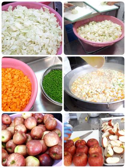今日の献立は、鶏肉のガーリック焼き・豚肉と野菜のスープ煮・りんご・おさつパン・牛乳でした。