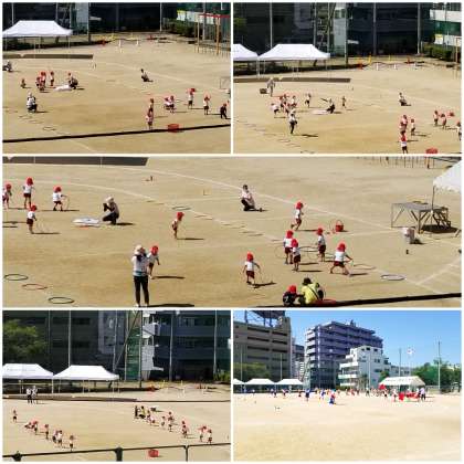 今日も、瓜破北幼稚園の園児さんが、本校の運動場で運動会の練習をしています。