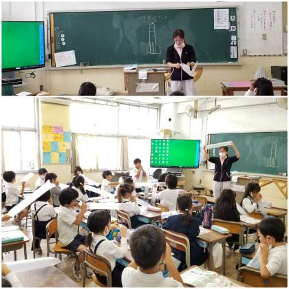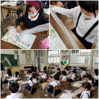子ども達の目の前には、雨に濡れた傘を入れる傘袋が。