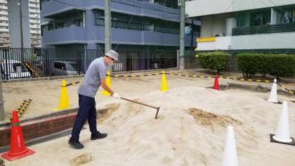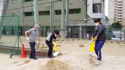 運動場の砂場では、理科の学習『流れる水の働き』のための準備を進めています。