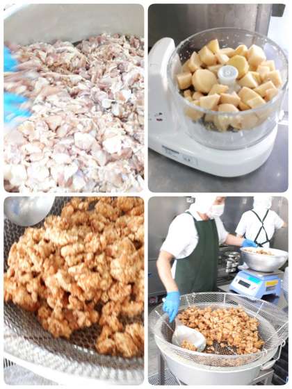 鶏肉にしょうが汁・料理酒・こいくちしょうゆで下味をつけ、でんぷんをまぶして揚げています。下味をつけることで、風味・色合い良く仕上がります。