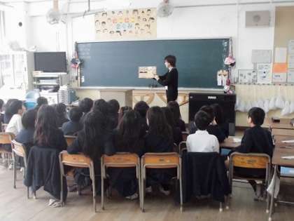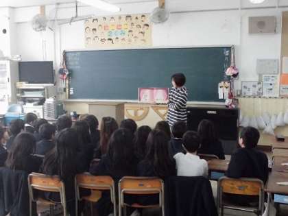 全学年で実施している、平野図書館ボランティアグループおはなし「たからばこ」さんによるおはなし会が今日は2年生で行われました。