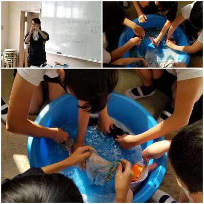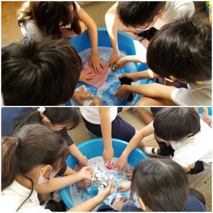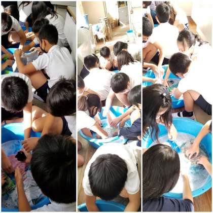 大きなたらいに水をためて、もみ洗い・つまみ洗いなど汚れものに合わせて洗濯します。