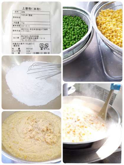 コーンクリームシチュー【米粉】は、小麦アレルギーのある児童も食べることができるように小麦粉を使った手作りルウの代わりに、水どきの上新粉でとろみをつけます。