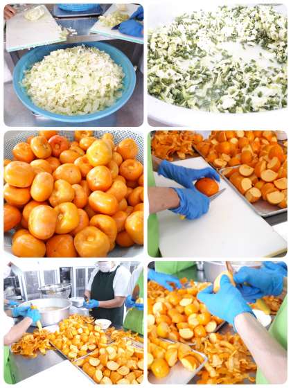 今日の献立は、コーンクリームシチュー【米粉】・キャベツとさんどまめのサラダ・かき(平核無柿)・コッペパン・いちごジャム・牛乳でした。