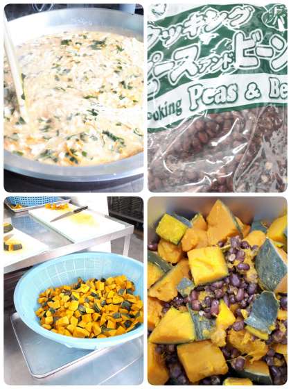 かぼちゃのいとこ煮は、だしで煮あげたかぼちゃを砂糖・みりん・うすくちしょうゆで味つけし、ドライパックのあずきを加えて煮たあと火を切ってしばらく味を含ませています。