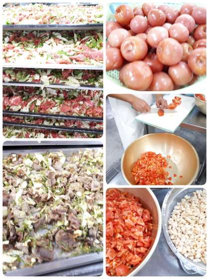 牛肉のカレー風味焼きは、牛肉をワイン・塩・粗挽きこしょう・カレー粉・綿実油で下味をつけ、キャベツとピーマンを混ぜ合わせ焼きもの機という機械で焼いています。