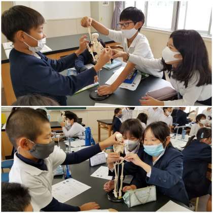 模型を使って、体の曲げられるところを観察しています。
