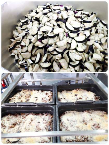 今日の献立は、なすのミートグラタン・鶏肉と野菜のスープ・みかん・黒糖パン・牛乳でした。