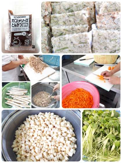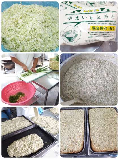 鶏卵・水・やまいもとろろ・小麦・塩で作った生地にかつおぶし・あおのり・キャベツ・青ねぎを加えて焼き、一人分ずつ切り分けています。