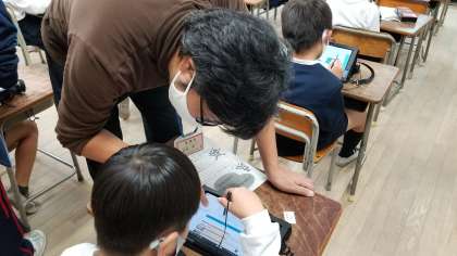タブレット端末上にある、四角形や三角形を組み合わせて、教科書の見本と同じ形を作っています。