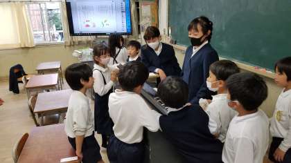 1年生の教室で、6年生が人気アニメの主題歌をオルガンで弾き、一緒に楽しんでいました♪