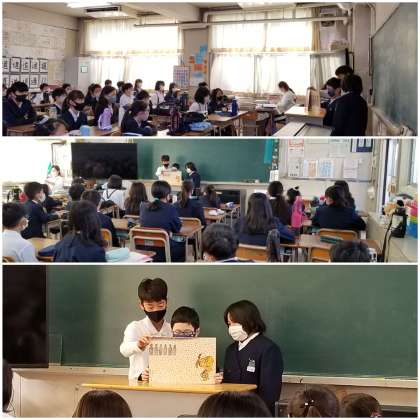 金曜日に1年生の教室で、紙芝居を読むことになっている図書委員のメンバーが、学級の友達の前で練習をしています。