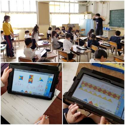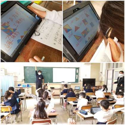 タブレット端末を使って、自由に直角三角形を動かします。